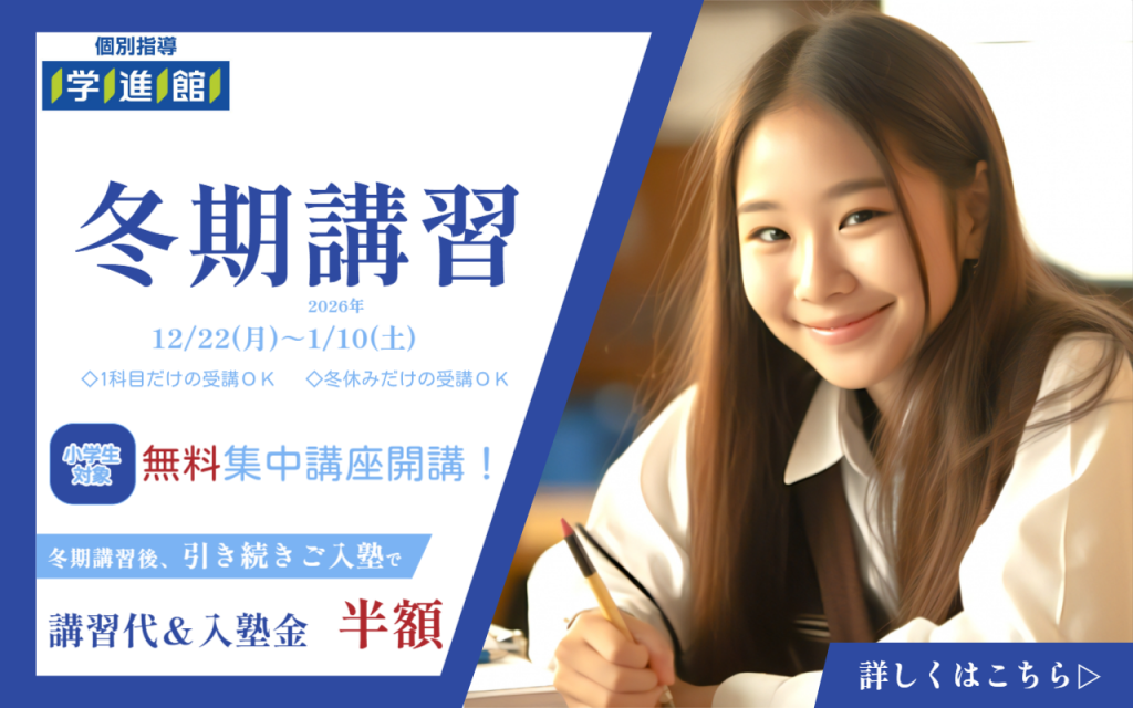 学進館からのお知らせ 2025年 冬期講習 申込受付中! 2025年11月21日 冬期講習 受講生受付中! 受験生は最後追い込みの冬になります。 中学生も高校生も3年間の総復習と受験対策に追われているでしょうか。 そのほかの学年のみなさんも定期テストの 時期だと思います。 定期テストが終わったタイミングや結果が返ってくる今、学進館で1学期2学期の総復習をしませんか^^ 冬期講習の曜日・時間など、詳しくは 下記お問い合わせフォームまたはお電話にて お問い合わせください♪