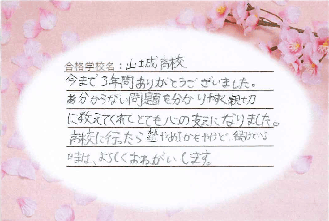 今まで3年間ありがとうございました。分からない問題を分かりやすく親切に教えてくれてとても心の支えになりました。高校に行ったら塾やめるかもやけど続けている時はよろしくおねがいします。