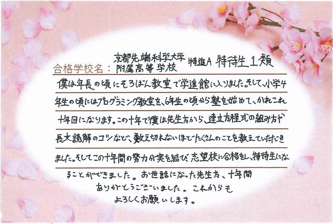 僕は年長の頃にそろばん教室で学進館に入りました。そして小学4年生の頃にはプログラミング教室を、6年生の頃から塾を始めて、かれこれ十年目になります。この十年で僕は先生方から、連立方程式の組み方や長文読解のコツなど、数え切れないほどたくさんのことを教えていただきました。そしてこの十年間の努力が実を結び、志望校に合格をし、特待生になることができました。お世話になった先生方、十年間ありがとうございました。これからもよろしくお願いします。