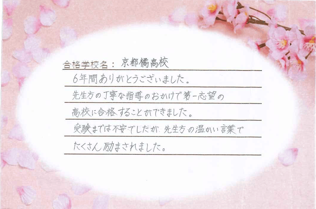 6年間ありがとうございました。先生方の丁寧な指導のおかげで第一志望の高校に合格することができました。受験までは不安でしたが、先生方の温かい言葉でたくさん励まされました。
