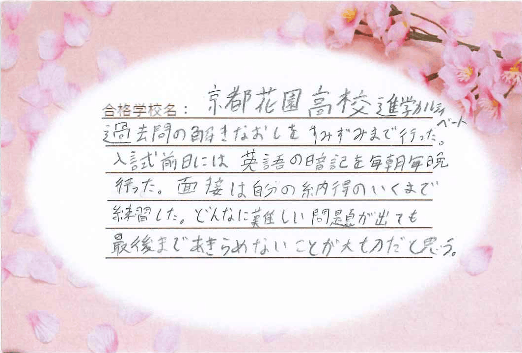 推薦だからといって勉強を怠けるのではなく、毎日、塾に行き受験科目の学習をしていたおかげで、自信を持ったまま受験に臨むことができ。無事第一志望に受かることができました。毎日勉強を見てくださって先生方には感謝しかありません。