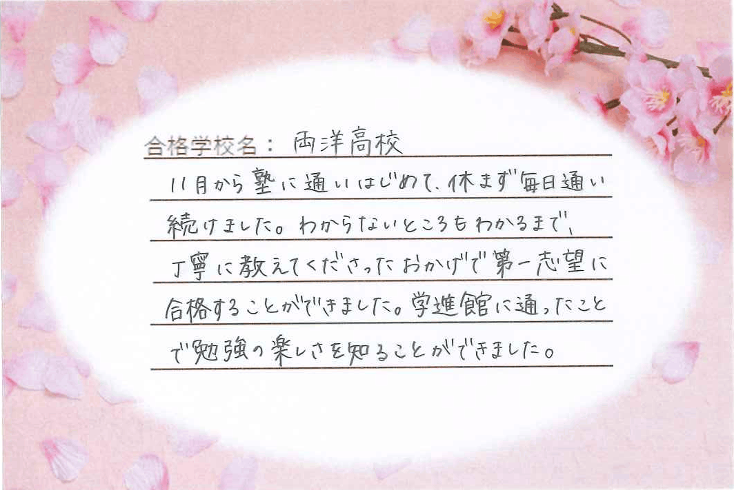 11月から塾に通いはじめて、休まず毎日通い続けました。わからないところもわかるまで、丁寧に教えてくださったおかげで第一志望に合格することができました。学進館に通ったことで勉強の楽しさを知ることができました。