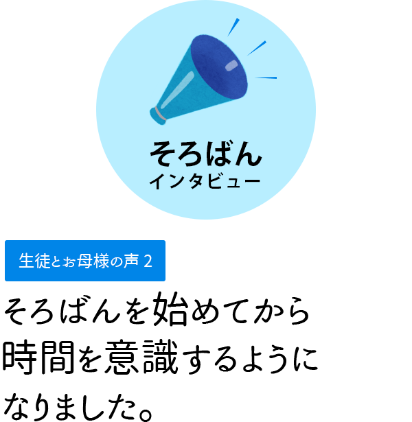 1人っ子でのんびりした性格なのですが、そろばんを始めてから時間を意識するようになりました。学校の宿題なども「もう終わったの?」という事が多くなり、30分で解く問題も時間内に終わらせています。