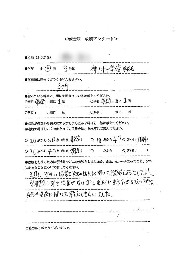 入塾したときの数学の点数はだいたい70点台だったけど、中3になって80点台を取れるようになってきて、今回は95点を取れて嬉しかった。家で勉強も頑張ったし、先生にも教えてもらってやる気も出させてもらえた。